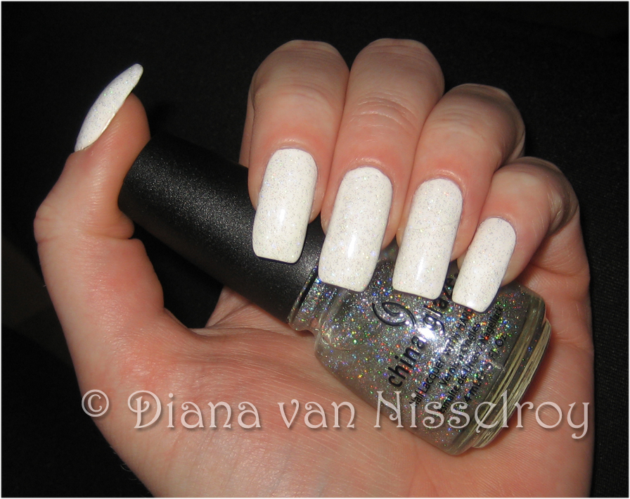 A swatch of OPI Apline Snow with China Glaze Fairy Dust.